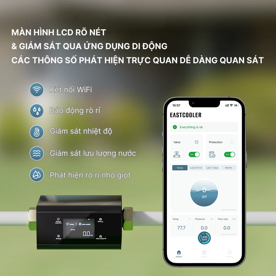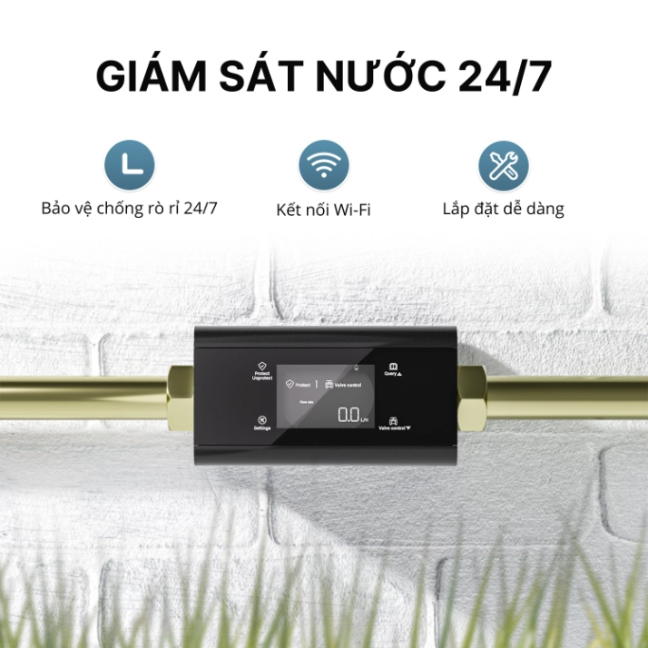 Ngay khi phát hiện dấu hiệu rò rỉ hoặc dòng chảy bất thường, DigiMonitor Pro sẽ tự động đóng van nước tổng chỉ trong vài giây, không cần chờ sự can thiệp từ con người. Cơ chế này đặc biệt quan trọng trong những tình huống sự cố xảy ra khi không có ai ở nhà, vào ban đêm hoặc trong lúc gia đình đi công tác, du lịch.